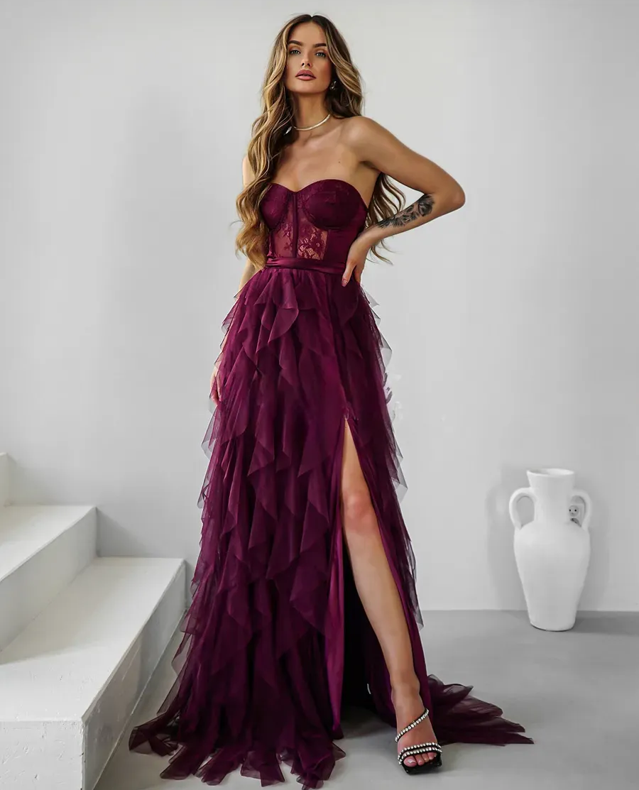 Глубокий и благородный бордовый цвет в сочетании с воздушной конструкцией юбки делает это платье идеальным выбором для самого особенного вечера. Это не просто длинное платье — это готовый образ королевы бала, в котором вы будете чувствовать себя неотразимо.
