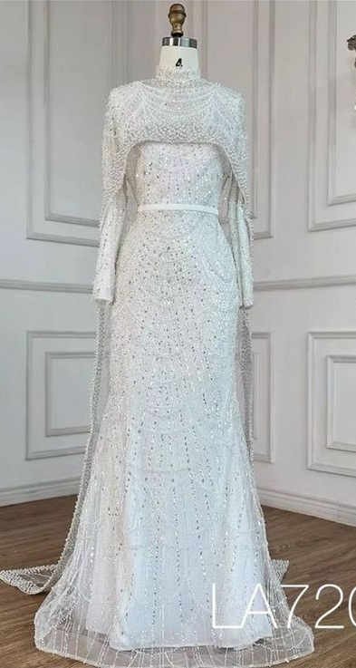 Ищете закрытое длинное свадебное платье в мусульманских традициях? Это нарядное платье, расшитое камнями и бусами, станет идеальным выбором для торжества. Элегантный съемная накидка добавляет образу величия и соответствует требованиям хиджаба.
