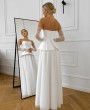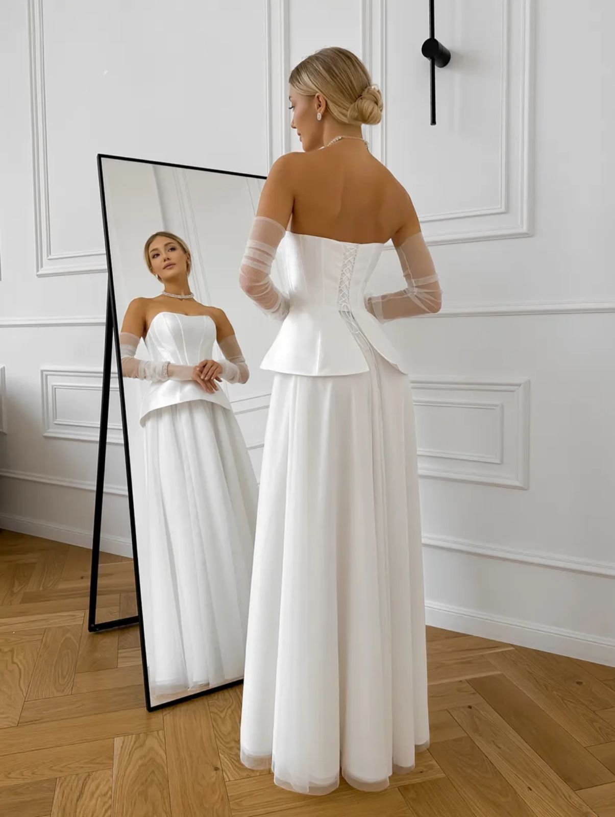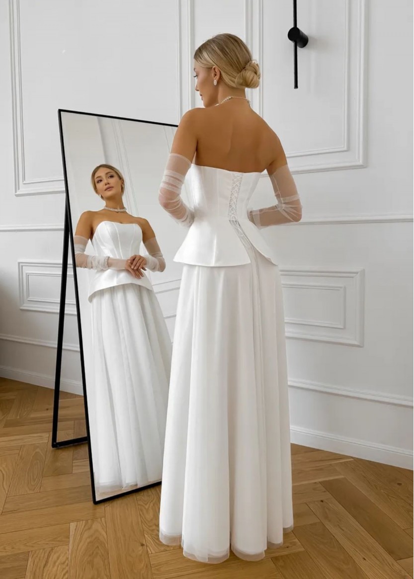 Элегантный корсет с баской, выполненный из мерцающей тафты, придает образу нежности и изысканности. Пышная юбка из премиального стрейч-фатина мягко струится, подчеркивая женственный силуэт. Модель дополнена изящными регулируемыми рукавами – вы можете менять их длину и степень сборки по своему вкусу.